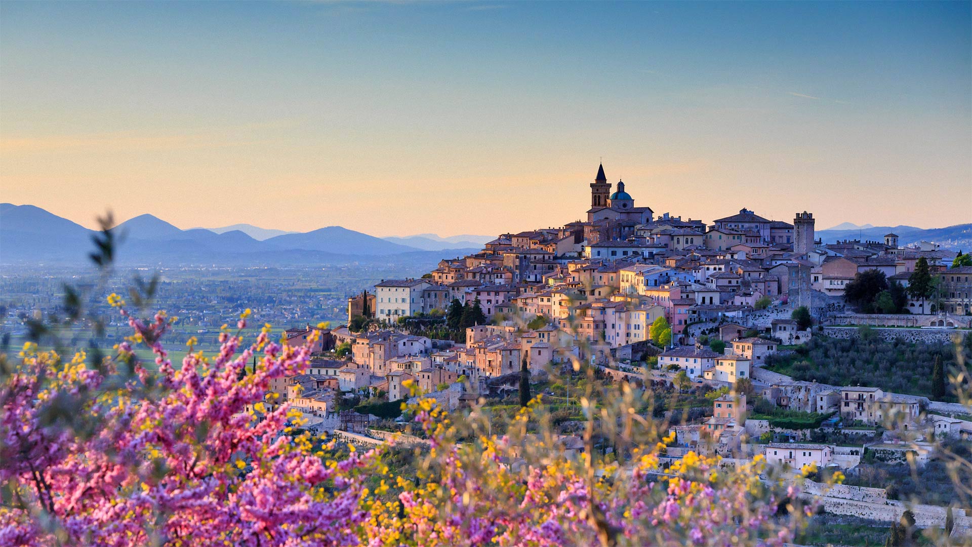 Almond blossoms overlooking Trevi, Umbria, 意大利 (© Maurizio Rellini/eStock Photo)