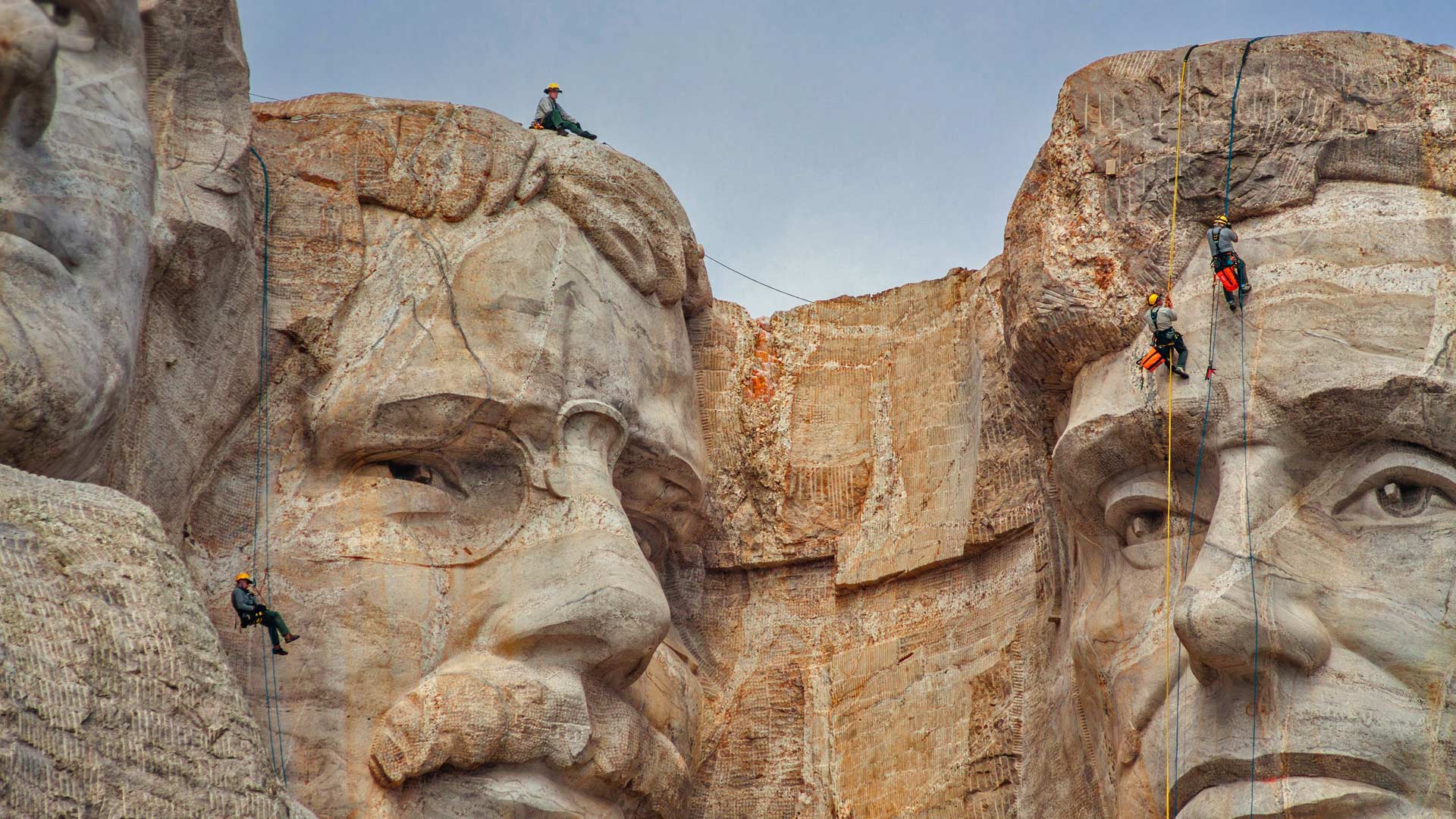 Park service employees inspecting Mount Rushmore National Memorial, 南达科他州 (© 环球图片社 via 盖蒂图片社)