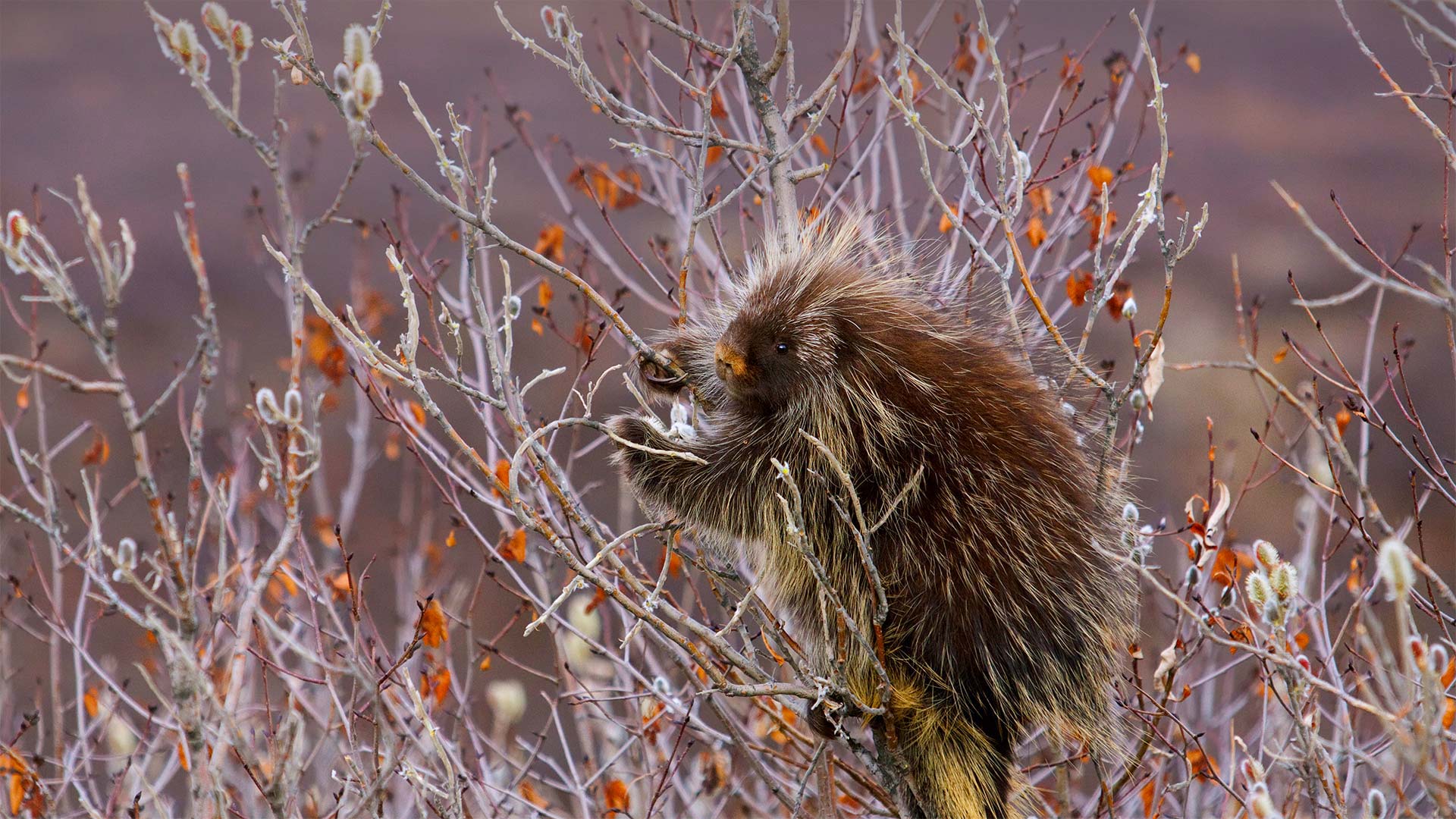A porcupine hangs on a willow tree branch, 阿拉斯加州 (© Design Pics/达妮塔·德利蒙特)